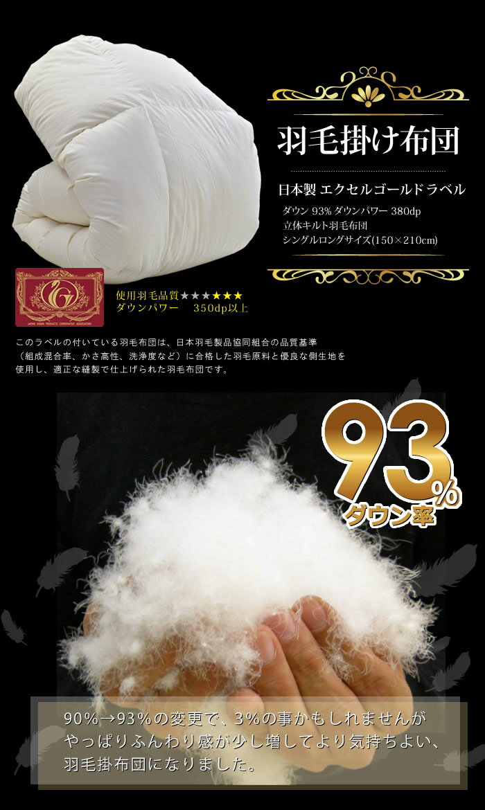 \リニューアルしました!/ 当店で一番売れている! 【羽毛6点セット布団シングル】 ・エクセルゴールドラベル付 羽毛布団ヌードタイプ ・防ダニ加工わた入り 軽量ボリュームアップ敷布団 ・お好きな高さの枕が選べる2種類 ・カバー3点セット選べる8カラー (・掛・敷・枕が収納出来る保存用収納用袋 付き) エクセルゴールドラベル付 羽毛掛布団 約150×210cm 側生地:ポリエステル80%綿20% (生成) 中身:ダウン93% フェザー7%約1.3kg 仕様:エクセルゴールドラベル付 ・380ダウンパワー ・4×5マス立体キルト ・クリーンアップ加工 ・カバーズレ防止8カ所ループ付き 生産地:日本製 当店オリジナル商品 ★