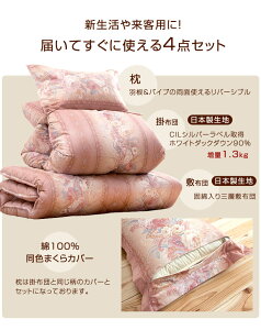 ダブルサイズはこちら!日本製 CILシルバーラベル羽毛布団と 三層敷布団・枕・枕カバーのセット 仕様掛布団150x210cm(シングルロングサイズ)生地:綿100%(超長綿60サテン) 詰め物:ホワイトダックダウン90% フェザー10%充填量:約1.3kg【スタッフみどぅのおすすめポイント!】 ・CILシルバーラベル取得の羽毛布団に敷布団、枕、枕カバーが付いた4点セット! ・羽毛の膨らみを示すダウンパワーは350dp以上!・国内パワーアップ加工により、更にふんわり感UP! ・新技術アレルGプラスで抗菌 消臭! ・除菌・防臭効果のあるオゾンスペシャルエイド加工・国内でひとつひとつ丁寧に作られた日本製 ・肌触り滑らかな超長綿生地 ・敷布団は固綿入りで底付き感を軽減 ・フェザー枕の片面にパイプを入れ、2通りの寝心地をお選び頂けます。