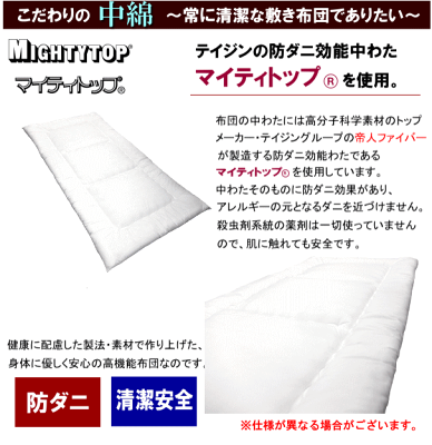 敷き布団は防ダニ加工マイティトップを中綿に使用した清潔敷布団。